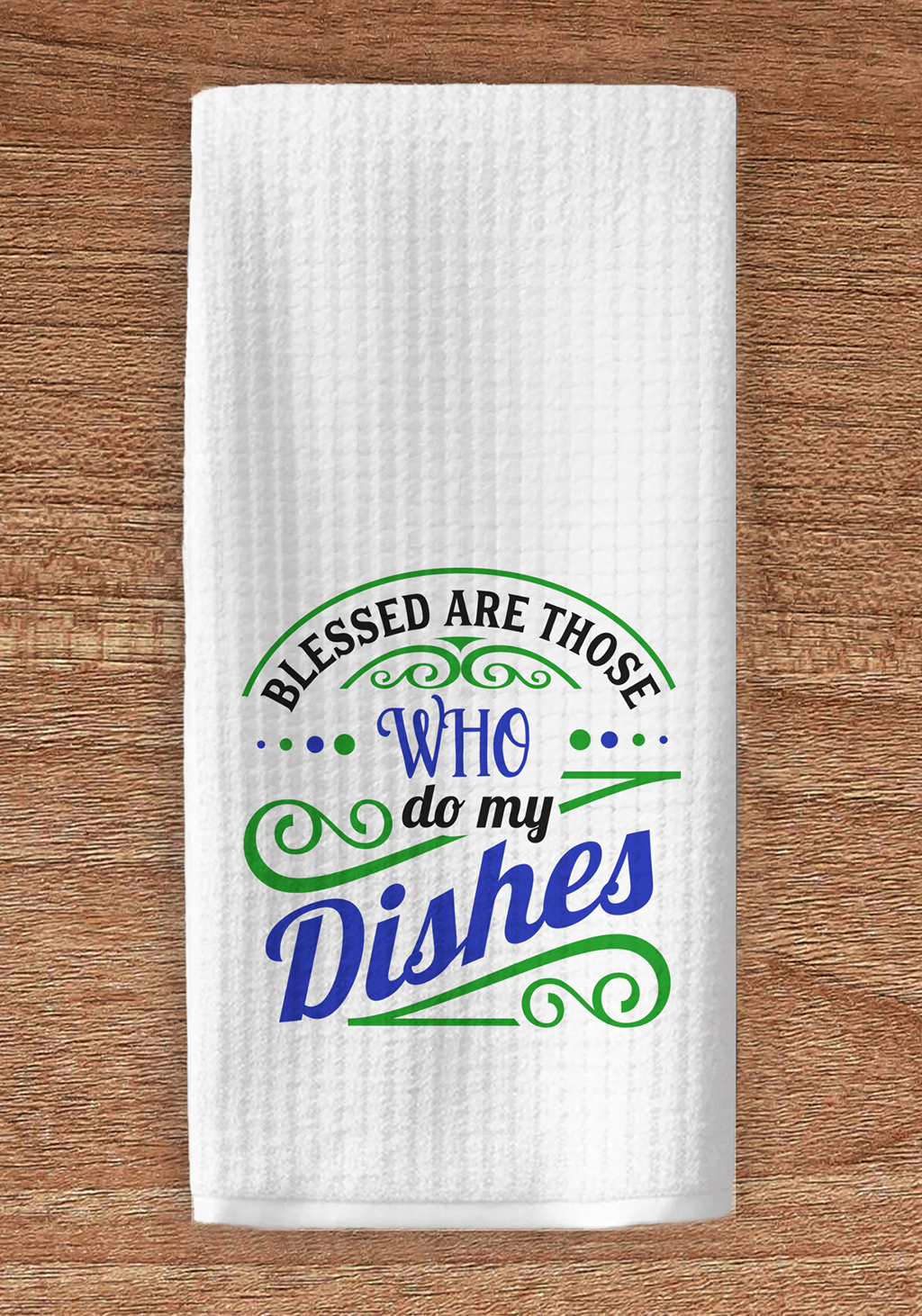 This funny kitchen towel says, "Blessed Are Those Who Do My Dishes," imprinted with permanent sublimation ink. It is 16” x 28”, super soft and ultra-absorbent professional weight waffle weave that holds more than 8x its weight in liquids but dries 2x faster than traditional fibers. Clean, dry, and polish, to a lint free and streak free shine in your home, office or vehicle.