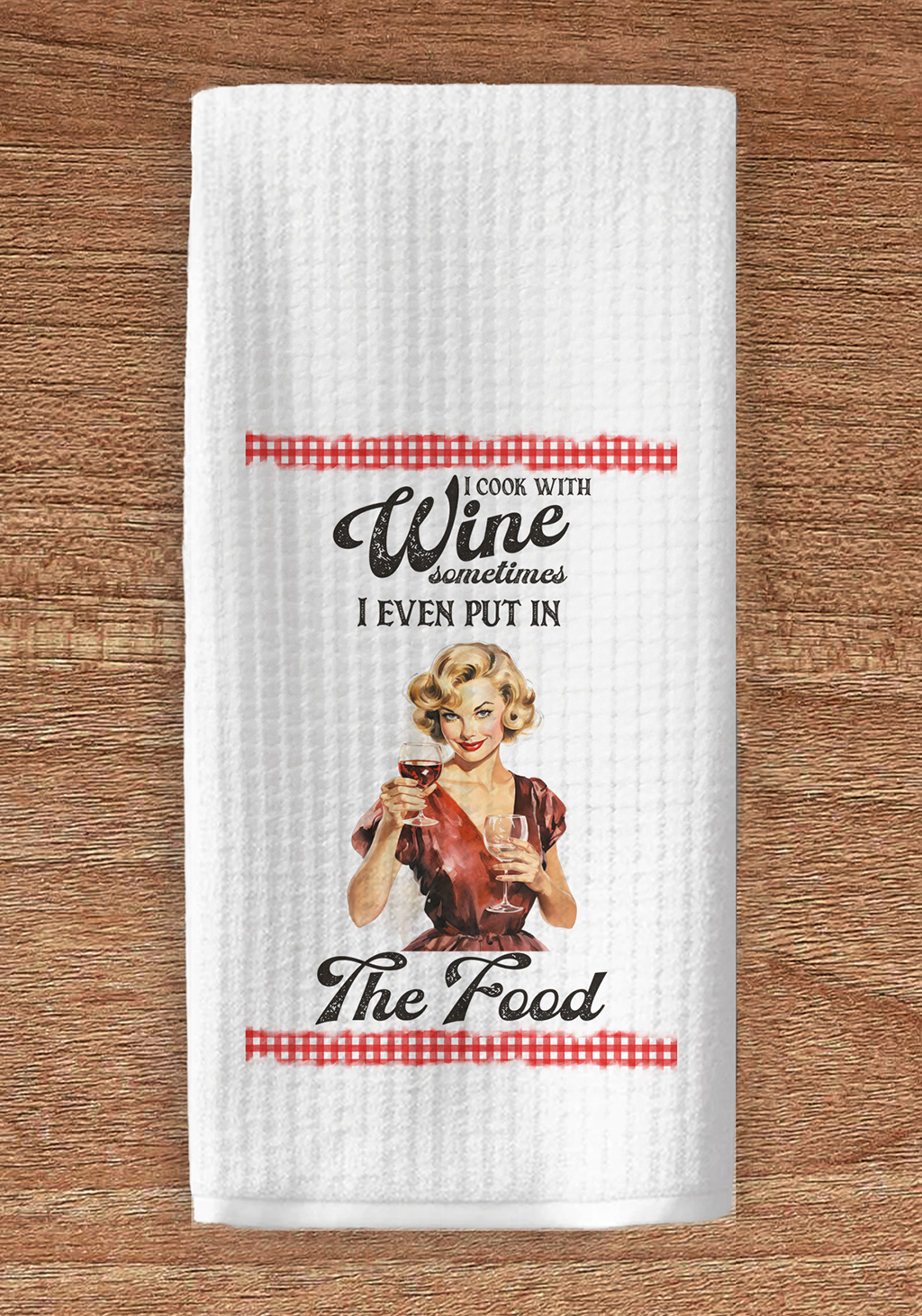 Add a splash of humor to your kitchen with this funny towel featuring the classic line: “I cook with wine, sometimes I even put it in the food.” Soft, absorbent, and perfect for cooks who love a good laugh (and a good pour).