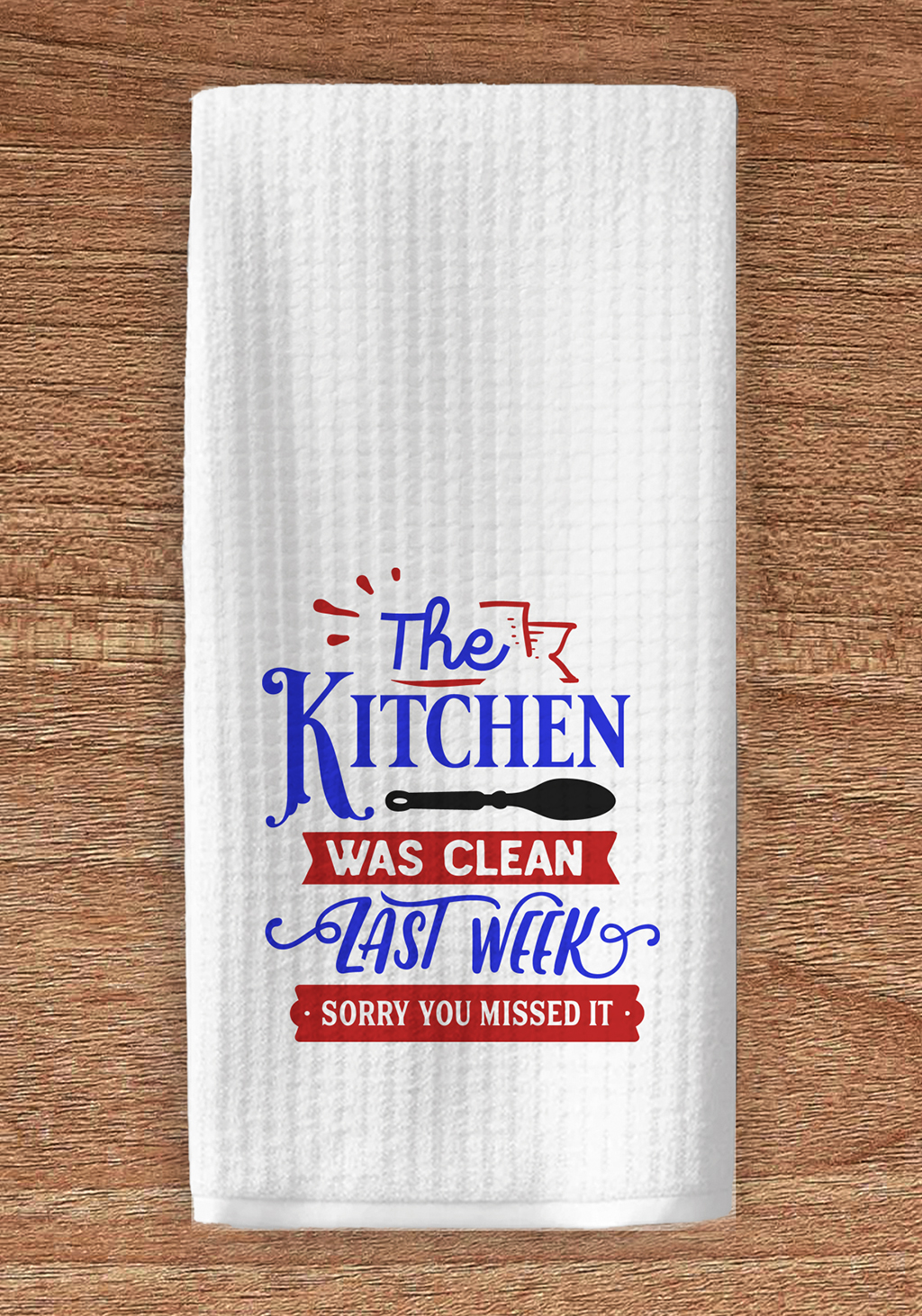 This funny kitchen towel says, “The Kitchen Was Clean Last Week Sorry You Missed It” imprinted with permanent sublimation ink. It is 16” x 28”, super soft and ultra-absorbent professional weight waffle weave that holds more than 8x its weight in liquids but dries 2x faster than traditional fibers. Clean, dry, and polish, to a lint free and streak free shine in your home, office or vehicle.