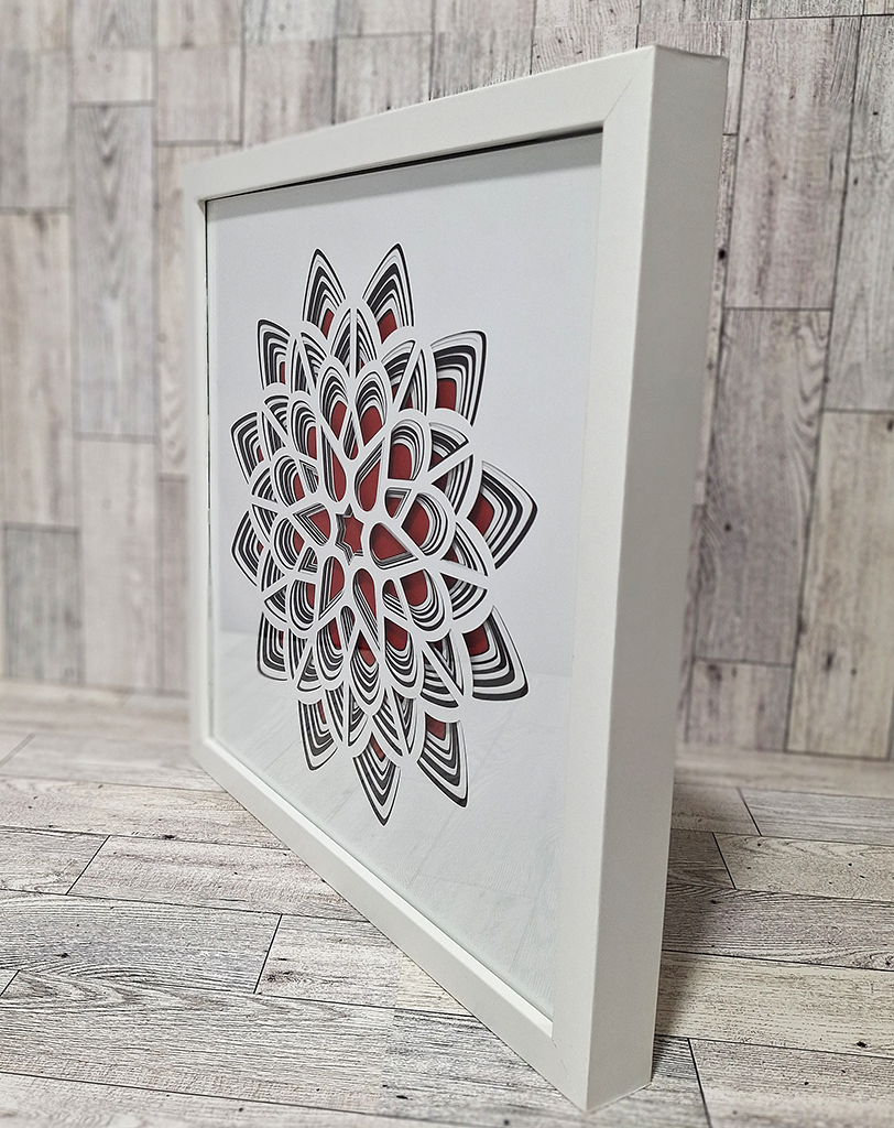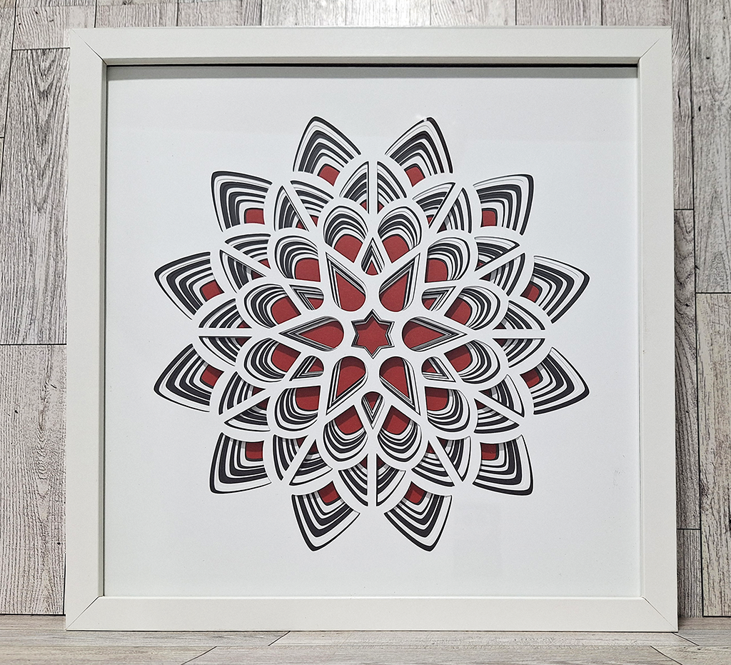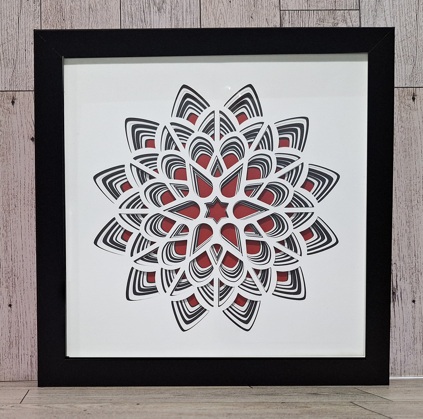 This layered paper shadowbox is bold and striking: The contrast between the black and white layers and the red center of this shadow box creates a strong, eye-catching design in monochrome elegance. The red serves as a focal point, adding a sense of passion and energy to the piece.
