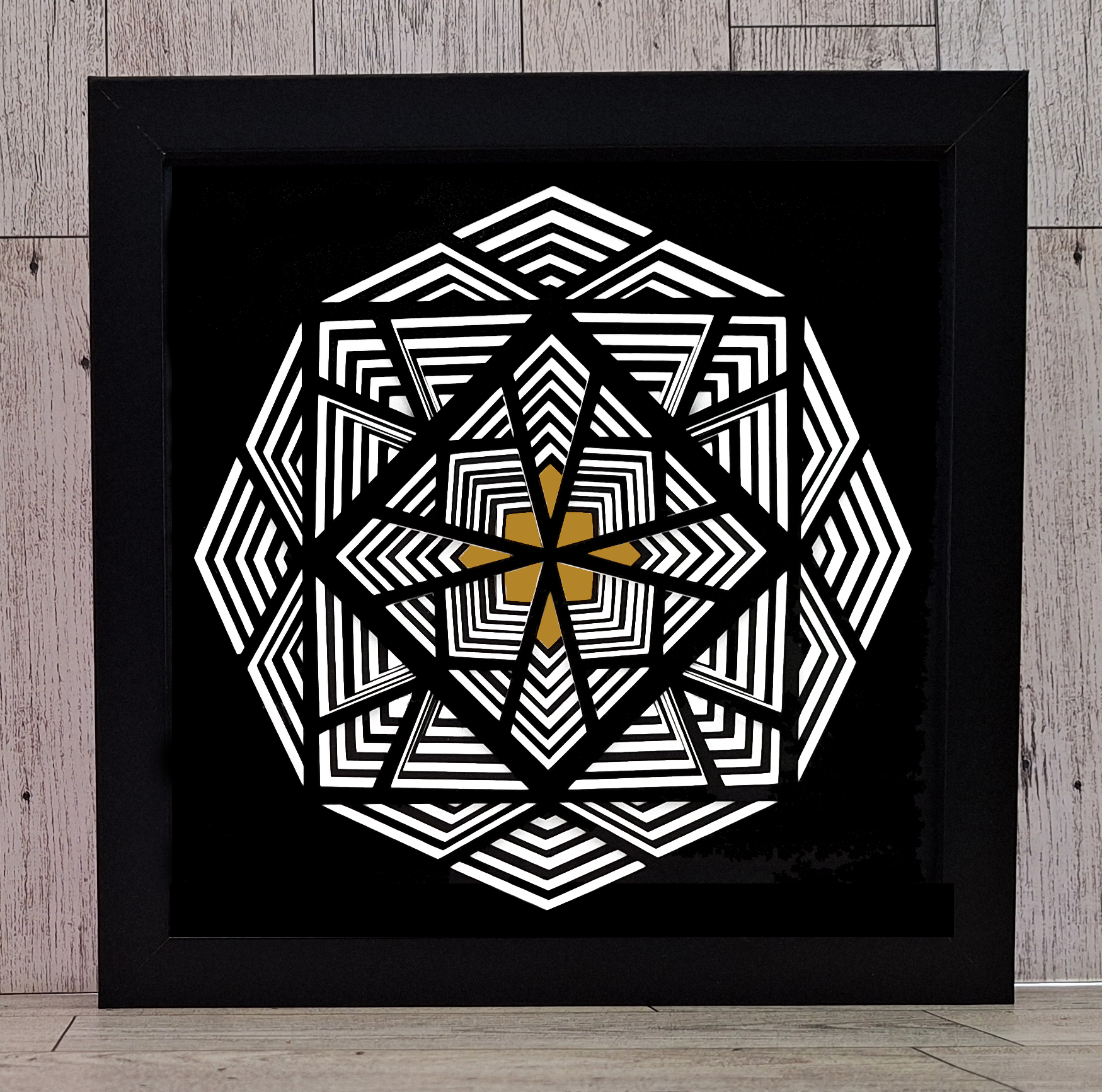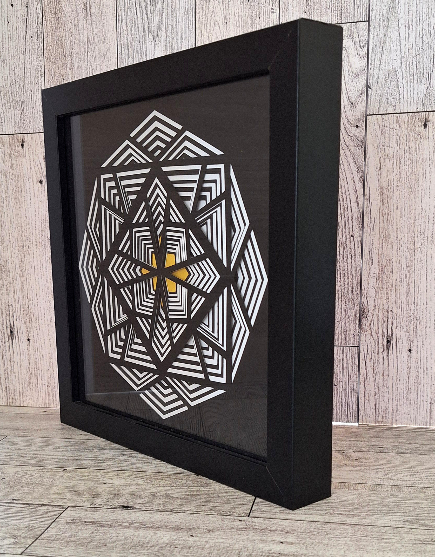 This elegant and modern shadowbox is crafted with precision. The combination of black and white gives a classic yet modern look, with the gold adding a hint of opulence. The 3D nature of the shadowbox allows for interesting plays of light and shadow, with the cuts casting subtle shadows on the layers behind them, adding depth and movement to the piece.