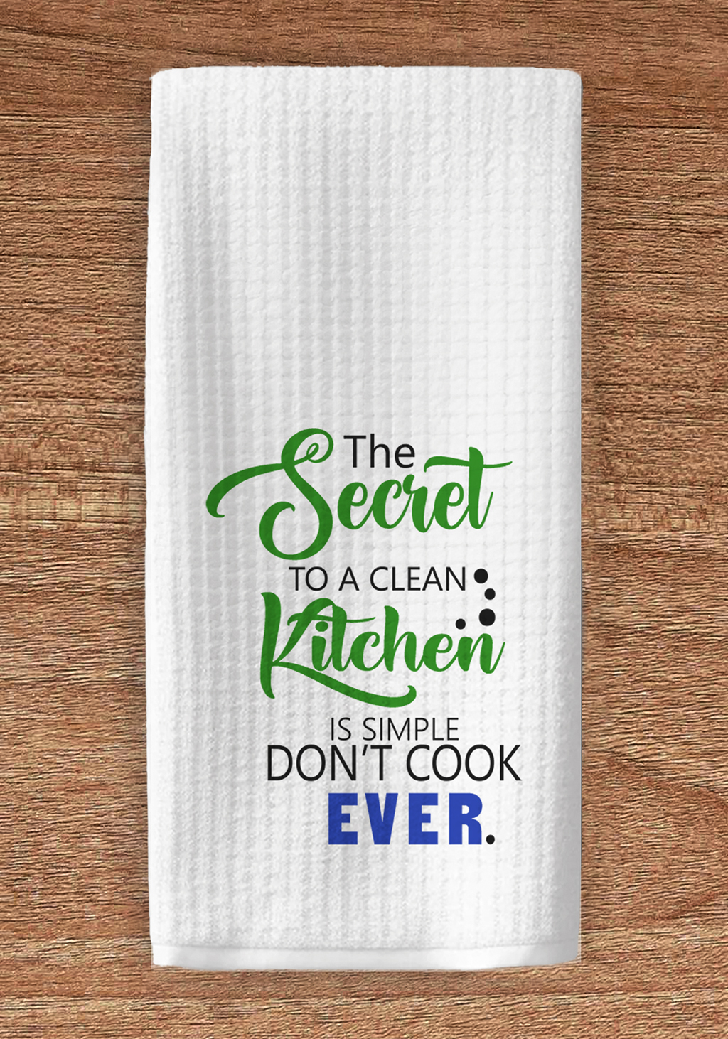 This funny kitchen towel says, "The Secret to a Clean Kitchen is Simple Don't Cook Ever," imprinted with permanent sublimation ink. It is 16” x 28”, super soft and ultra-absorbent professional weight waffle weave that holds more than 8x its weight in liquids but dries 2x faster than traditional fibers. Clean, dry, and polish, to a lint free and streak free shine in your home, office or vehicle.