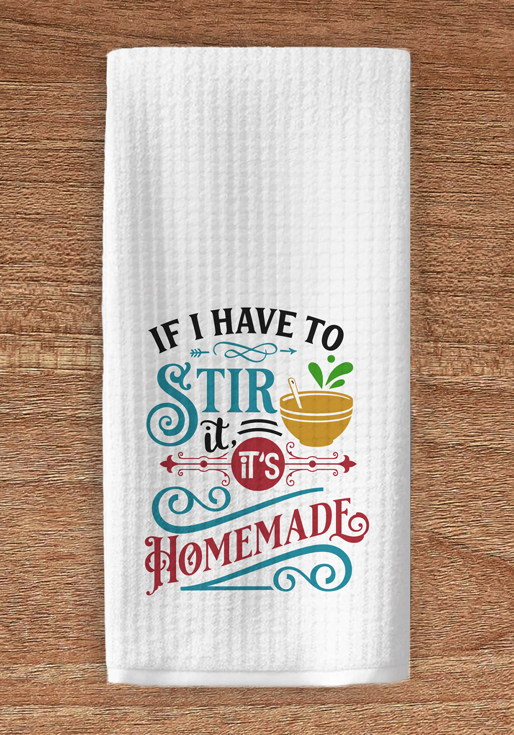 This funny kitchen towel says, “If I Have to Stir It, It’s Homemade,” imprinted with permanent sublimation ink. It is 16” x 28”, super soft and ultra-absorbent professional weight waffle weave that holds more than 8x its weight in liquids but dries 2x faster than traditional fibers. Clean, dry, and polish, to a lint free and streak free shine in your home, office or vehicle.