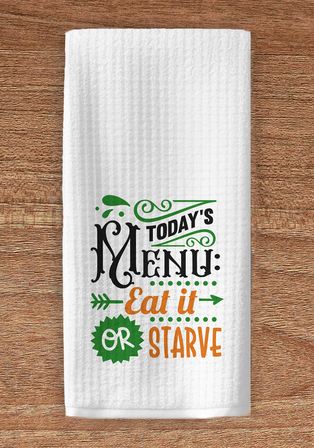 This funny kitchen towel says, "Today's Menu Eat It or Starve." It is 16” x 28”, super soft and ultra-absorbent professional weight waffle weave that holds more than 8x its weight in liquids but dries 2x faster than traditional fibers. Clean, dry, and polish, to a lint free and streak free shine in your home, office or vehicle.