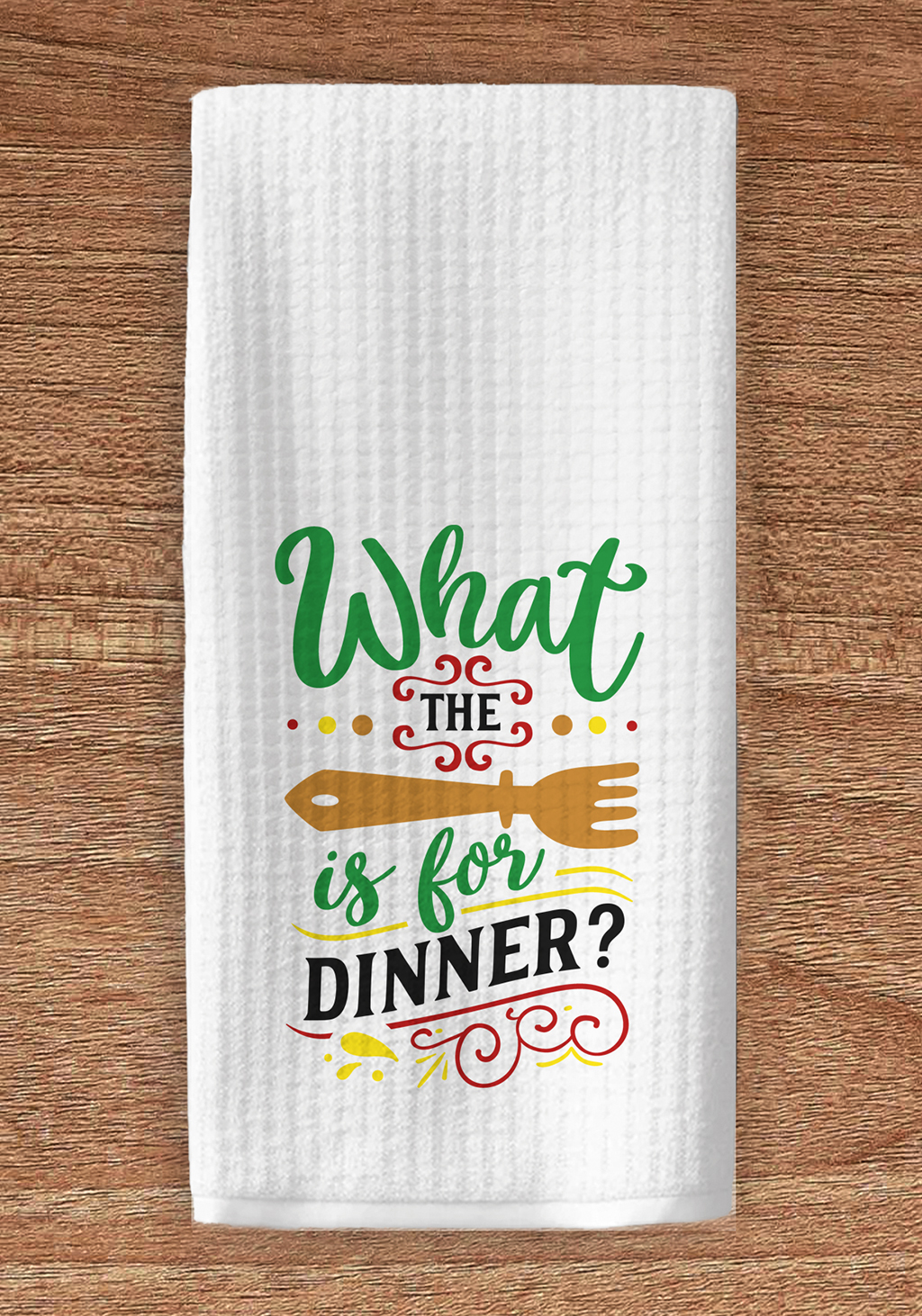 This funny kitchen towel says, “What the Fork is for Dinner?” imprinted with permanent sublimation ink. It is 16” x 28”, super soft and ultra-absorbent professional weight waffle weave that holds more than 8x its weight in liquids but dries 2x faster than traditional fibers. Clean, dry, and polish, to a lint free and streak free shine in your home, office or vehicle.